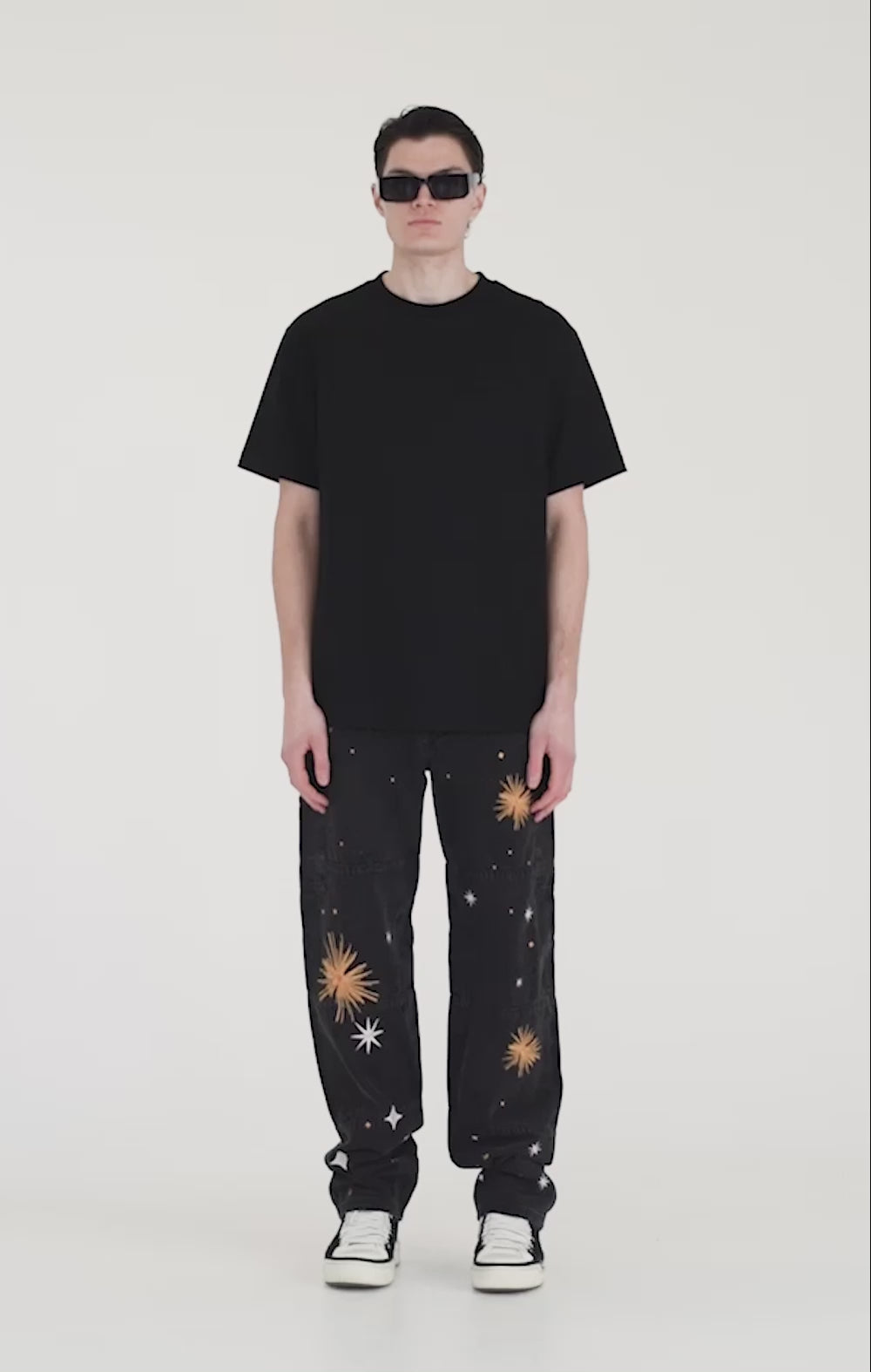 يتميز تي شيرت Midnight Split Covenant بعنصر تصميمه المميز - وهو عبارة عن لوحة مقسمة جريئة على كل من الأمام والخلف. تمت إعادة خياطة هذه الميزة المذهلة بدقة في خيط سميك، مما يضيف طبقة من التعقيد والعمق إلى جمالية الملابس. يعتبر اللون الأسود الغامق للقميص بمثابة قماش مثالي، مع التركيز على دقة الغرز والخطوط الواضحة للألواح المقسمة.