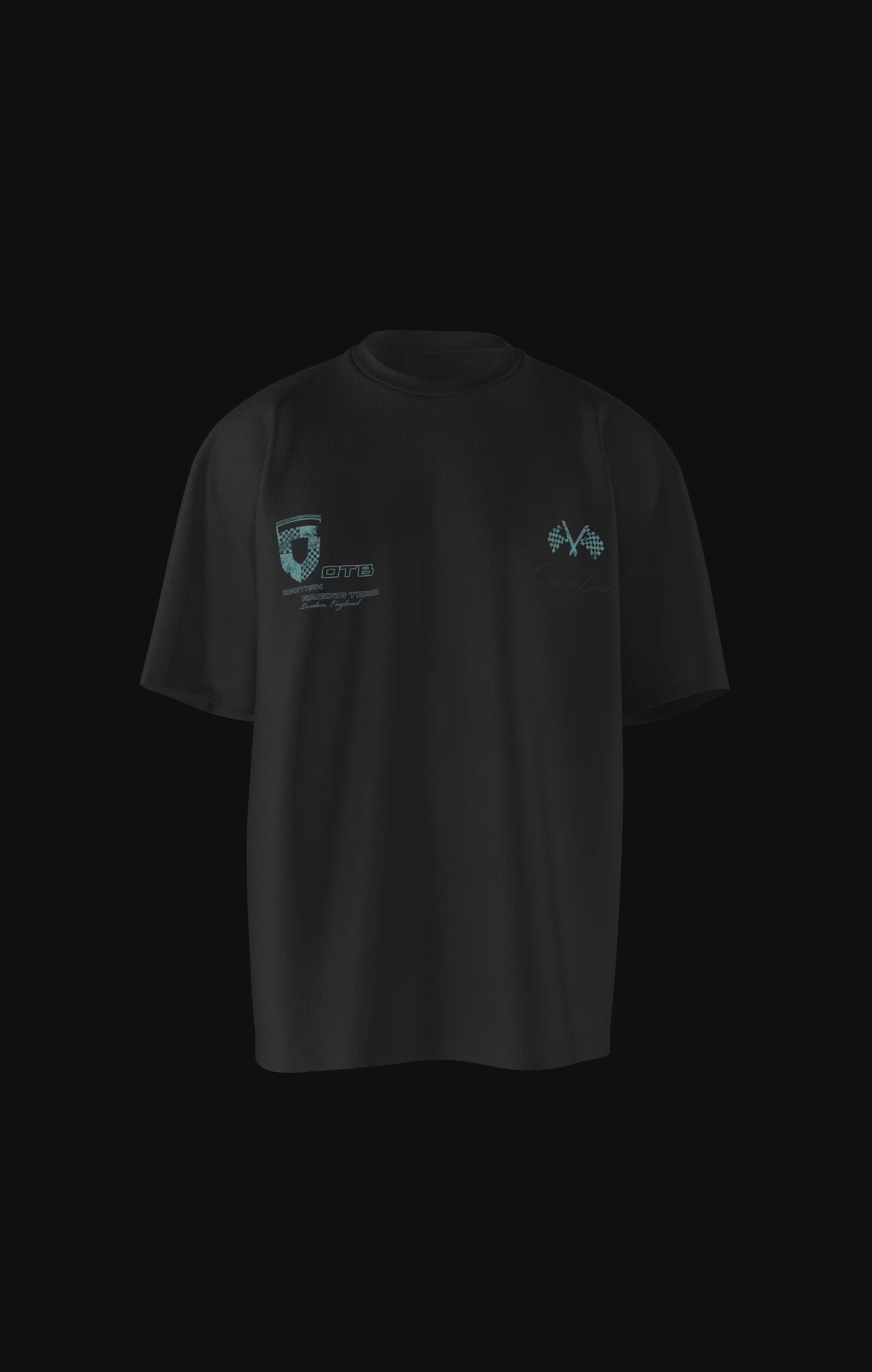 Das schwarze Motorsport-T-Shirt zeigt ein fesselndes hellblaues Siebdruck-Artwork, das eine Hommage an die aufregende Welt des Motorsports darstellt.