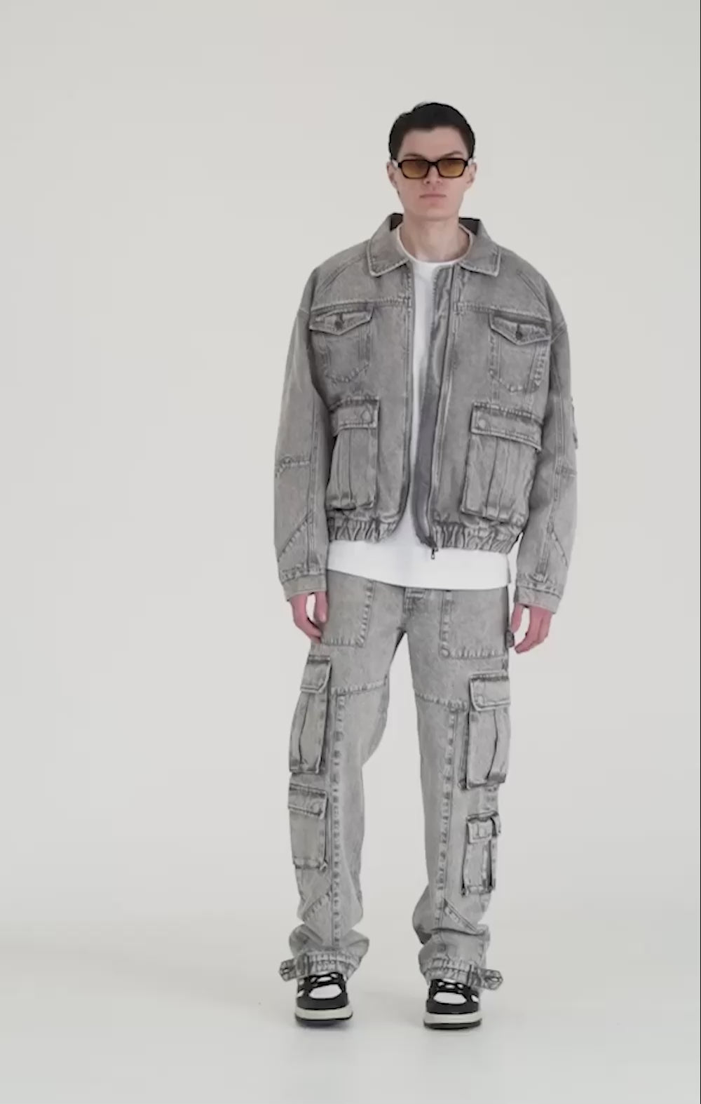 The garment is washed to create a unique grey hue, adding a modern twist to the classic denim jacket silhouette, making it versatile for various occasions and styles.