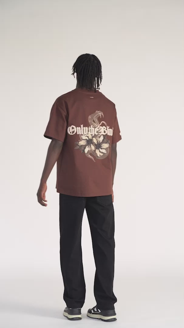 Tailored in our latest offering of 100% Organic cotton, this t-shirt in a a rich brown features a beige and brown snake artwork across the back with 3D raised embroidery across it, complimented by a matching tonal floral artwork on the chest with 3D embroidered branding.