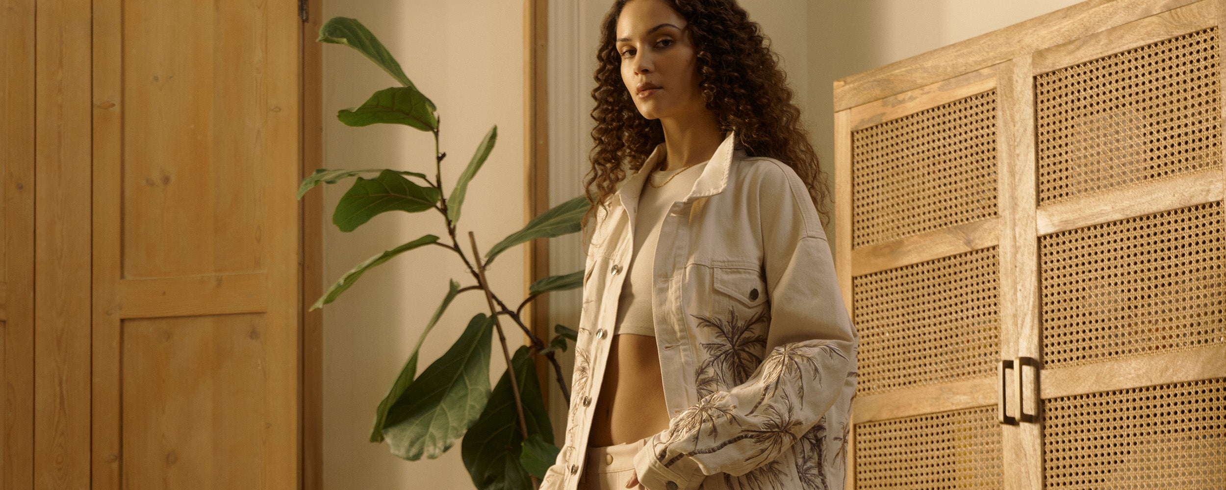Economisez 40%Beige Palm Denim Jacket - ONLY THE BLIND™Beige Palm Denim Jacket - ONLY THE BLIND™
