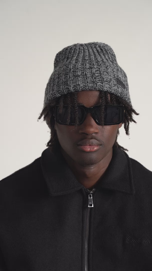 De Asphalt Woven Beanie, nieuw voor herfst/winter 2023, wordt gepresenteerd in een zachte, elastische zwarte en grijze kleur.