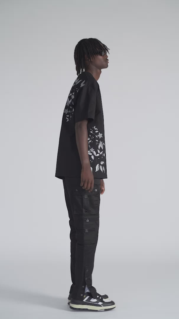 Dit t-shirt in gitzwart is gemaakt van ons nieuwste aanbod van 100% biologisch katoen en heeft een grijswaarden bloemenartwork aan de zijkant van de voorkant en op de schouder, aangevuld met grijs tonale 3D geborduurde borstmerken. De achterkant is voorzien van de kenmerkende trens van het merk bij de nek in bijpassend grijs.