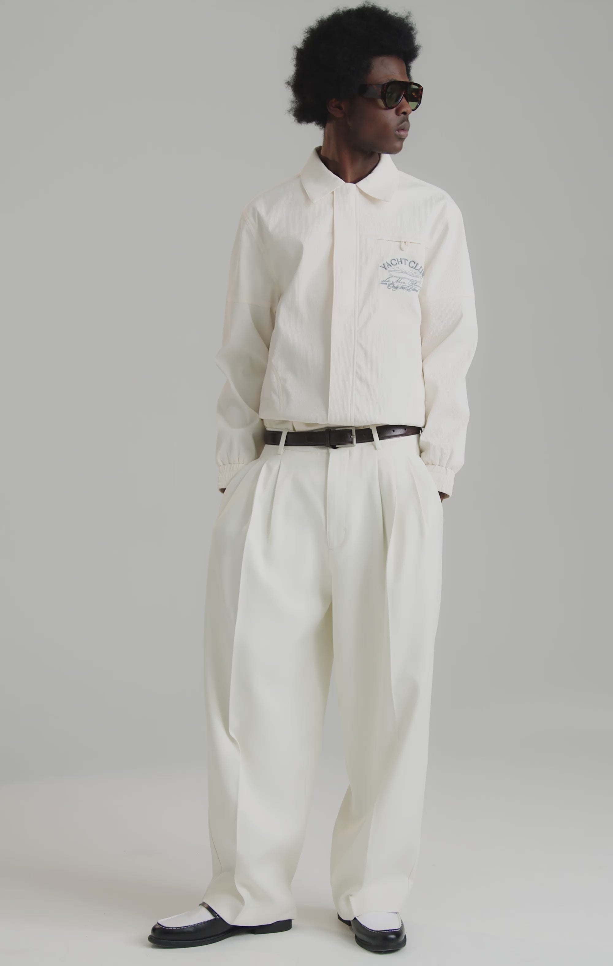 Crafted in an elevated off-white fabric with a subtle ribbed texture, this jacket combines relaxed structure with refined detailing. The silhouette features a sharp collar, concealed front zip fastening, elasticated cuffs and hem, and clean welt pockets, balancing tailoring with effortless coastal ease.