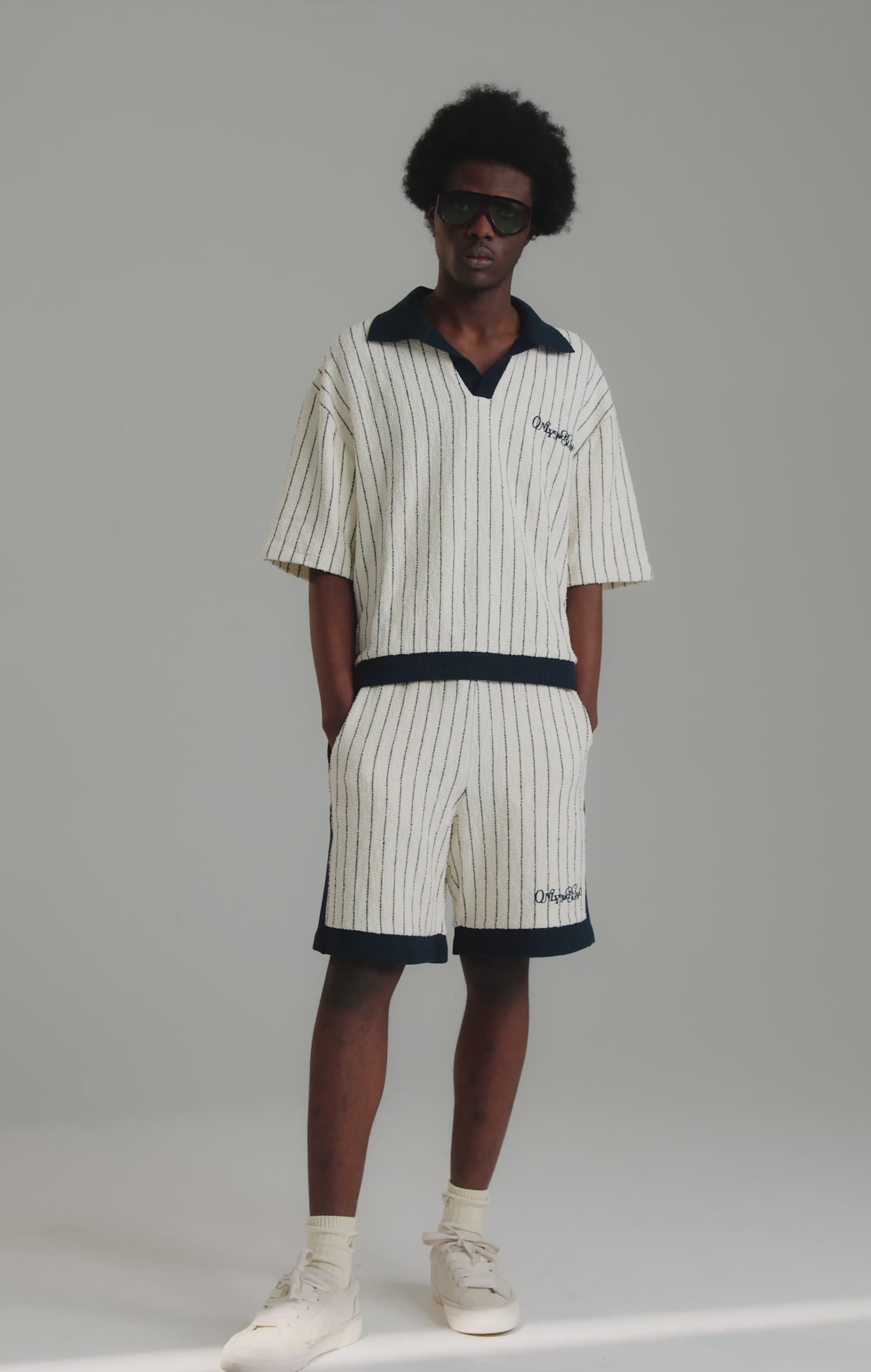 Crafted in a textured knit with fine vertical stripe detailing, the cream base is contrasted by deep navy ribbed trims at the waistband and hem. The silhouette is relaxed yet structured, offering comfort without compromising on shape. Subtle embroidered Only the Blind branding sits neatly at the leg, keeping the look understated and considered.